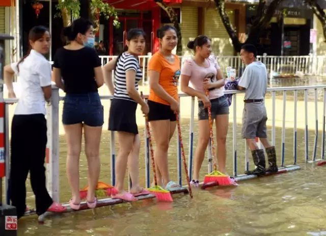 广西融水县县城,年轻的妇女们在等洪水退去后清除淤泥与垃圾(7月2日摄)。新华社记者张爱林摄
