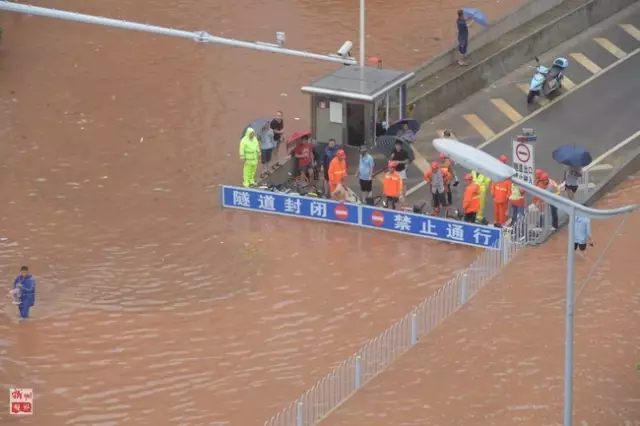 工作人员在长沙一处被洪水包围的过湘江隧道入口处设防(7月1日摄)。新华社记者龙弘涛摄