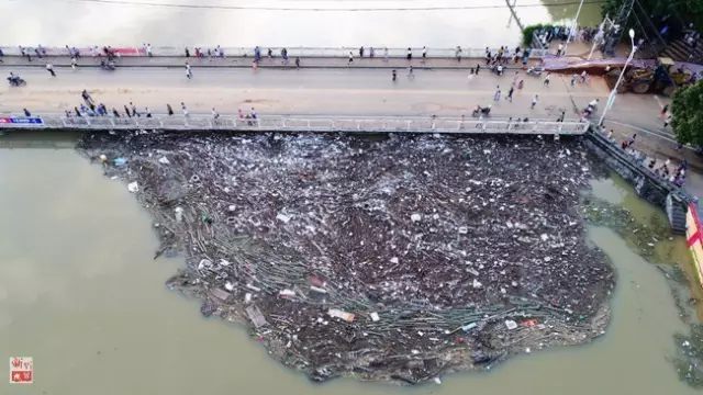 湖南桃江县县城内资江支流上的弄溪桥一侧积满洪水冲来的垃圾(7月1日摄)。新华社记者李尕摄