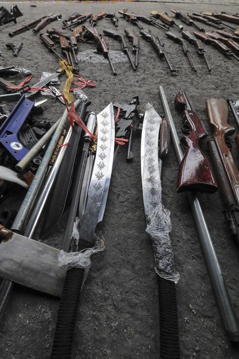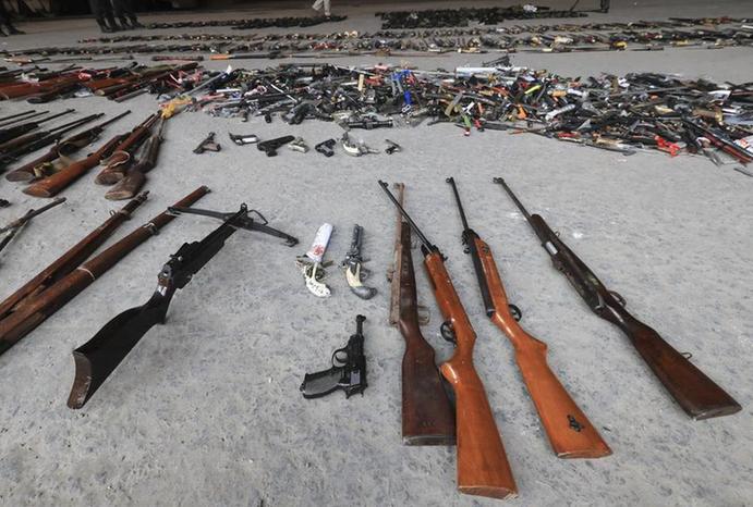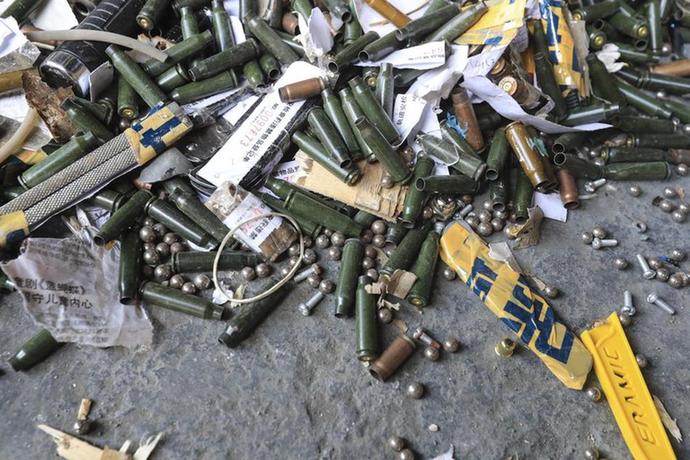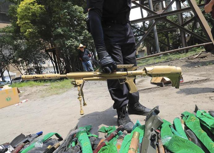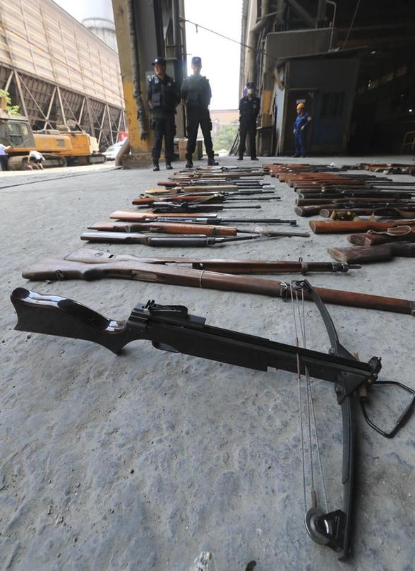 这是7月5日拍摄的全国公安机关集中收缴销毁枪爆物品行动辽宁沈阳现场展示的非法枪支等物品。此次销毁活动中,辽宁省公安机关销毁各类非法枪支2652支,子弹6.3万发以及一批爆炸物。