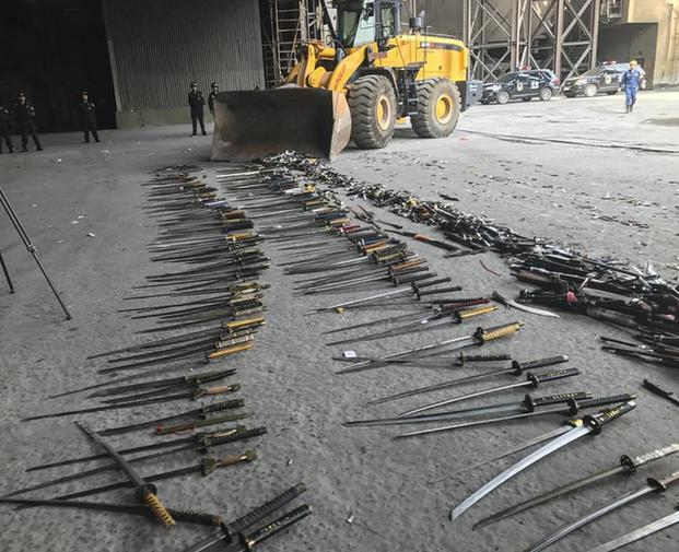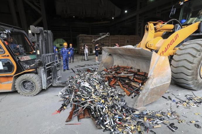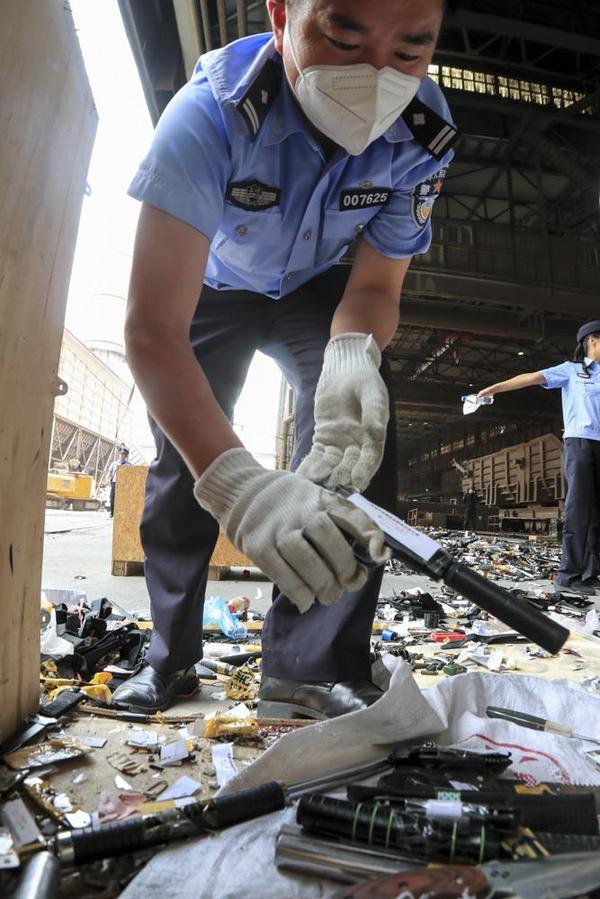 2017年7月5日,上海警方在宝山钢铁股份有限公司集中销毁一批收缴的非法枪支和管制刀具。