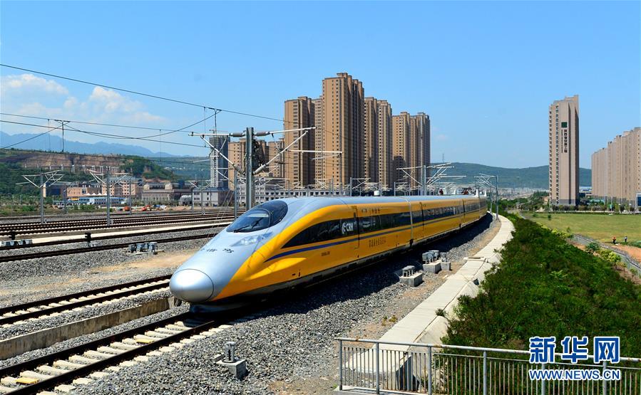 在陕西宝鸡,一列高速综合检测列车在宝兰高铁上行驶(5月16日摄)。