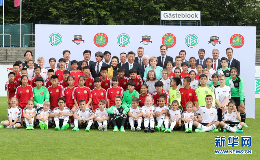 7月5日,国家主席习近平在柏林同德国总理默克尔共同观看中德青少年足球友谊赛。这是习近平和夫人彭丽媛同默克尔与双方小球员合影。新华社记者王晔 摄