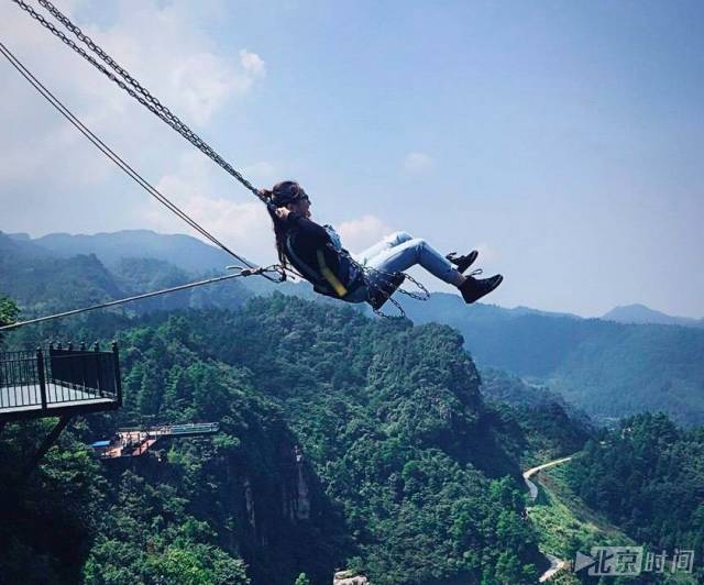 往外荡出时,感觉自己都要飞出去了,这是全国第一个建在悬崖边的秋千,居然还有4米、6米、8米不同的长度可以选。