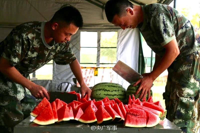 为武警水电第四支队的官兵们提供后勤补给的保障中队正在为官兵准备水果解暑