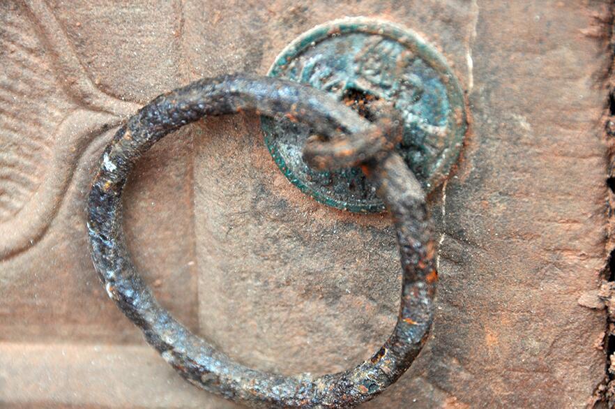 该墓葬最特别之处是在门环上嵌入了铜钱,考古专家分析称,从古墓所使用的材质和纹饰上看,墓主应该是属于富贵人家。图为石门的门环上嵌着宋朝铜钱。
