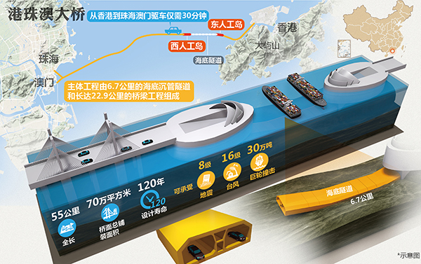 港珠澳大桥全长55公里,是连接香港、珠海和澳门的超大型跨海通道,包括海中桥隧主体工程,以及香港、珠海、澳门三地口岸和连接线。大桥建成后,往来珠海与香港国际机场时间将由4小时缩减至约30分钟,并将珠三角西部纳入香港3小时车程范围内。珠三角将形成世界瞩目的超级城市群。港珠澳大桥从动工建设到海中桥隧主体贯通,八年间攻克了一个又一个难关。港珠澳大桥是中国建设史上历程最长、投资最多、施工难度最大的跨海桥梁,被业界誉为桥梁界的“珠穆朗玛峰”。