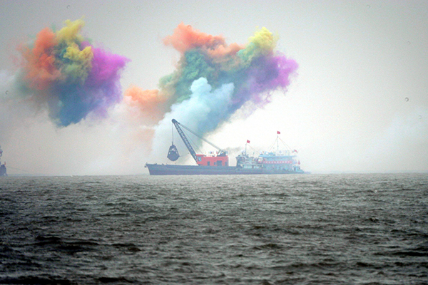 2009年12月15日,港珠澳大桥正式动工,珠澳口岸人工岛填海工程开工仪式于当日上午在珠海情侣南路东延长线一段举行。海上作业船抓斗挖出第一斗泥沙,标志着港珠澳大桥建设开工。视觉中国资料图