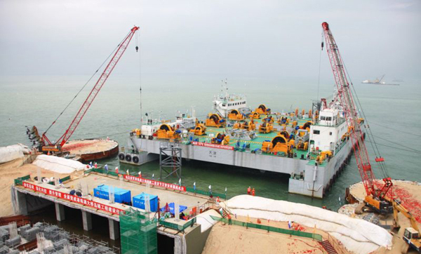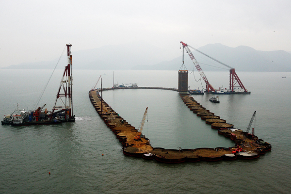 2011年12月7日上午,珠海,港珠澳大桥重点工程之一的人工岛最后一个巨型钢圆筒将深入海底,人工岛主体结构工程完工。用钢圆筒来进行海中人工岛堤围勾勒,这一技术的运用在世界上尚属首次。视觉中国资料图