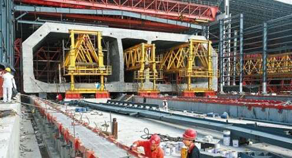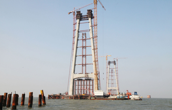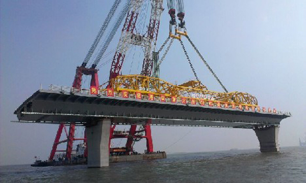2014年6月15日,CB05标水下基础施工顺利收官的同时,该标段上部结构的承台墩身和组合梁架设也正如火如荼推进。 新华社资料图