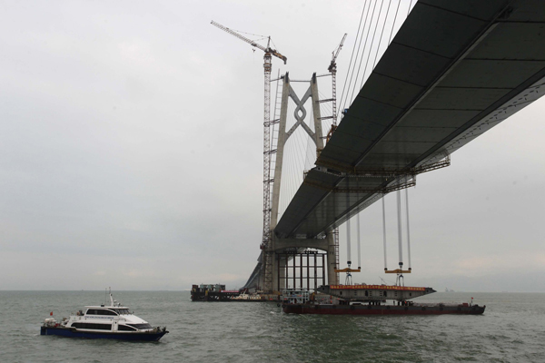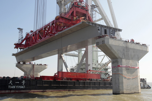 2014年1月19日上午10点58分,CB03标21号墩和22号墩北侧,港珠澳大桥深海区首跨钢箱梁架设成功,标志着港珠澳大桥主体工程建设取得了又一个阶段性突破,迈出我国外海桥梁建设长大构件吊装重要一步。新华社 资料图