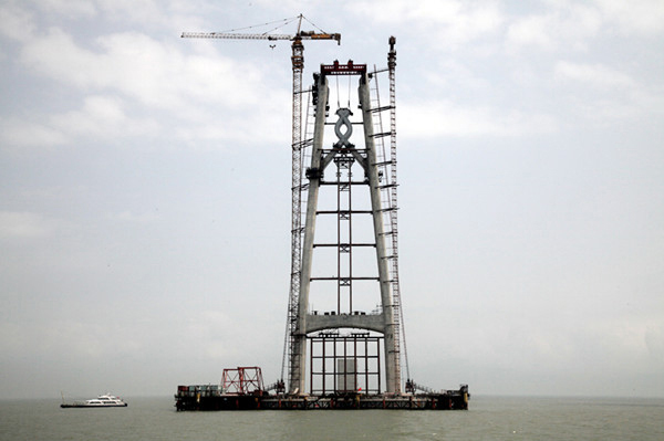 2015年1月8日上午,港珠澳大桥主体工程青州航道桥主塔成功封顶,为青州航道桥完成主跨合龙、实现全桥贯通奠定了坚实基础。东方IC 资料图