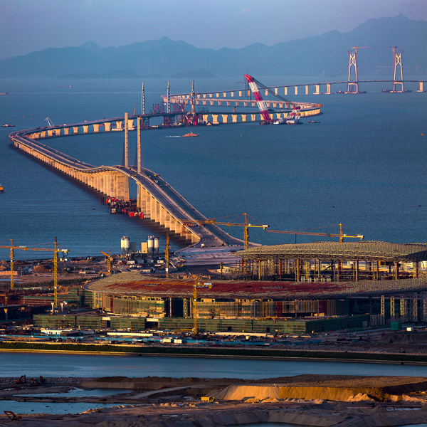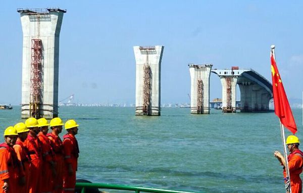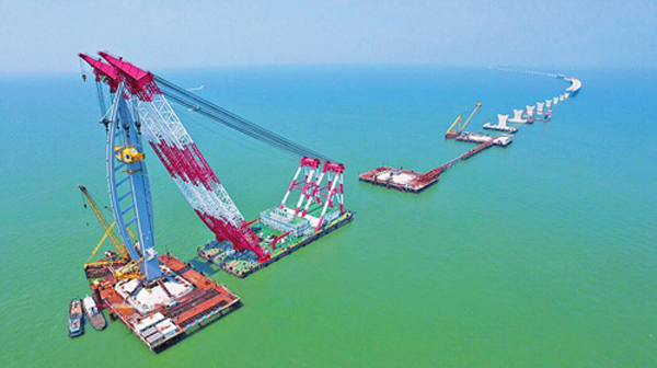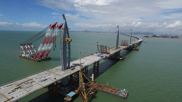 这标志着这座连接香港大屿山、澳门半岛和广东省珠海市的跨海大桥,已全面转入钢箱梁吊装的施工工序。该桥建设进入了工程冲刺阶段。?