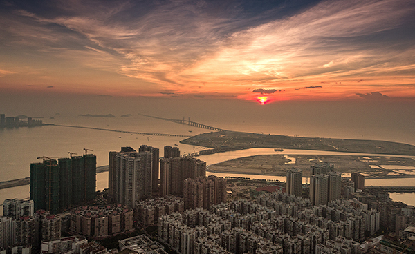 2015年6月16日,中国澳门,清晨时分,从澳门凼仔眺望港珠澳大桥工程、西湾桥,朝霞散去、日出东方,美轮美奂。 东方IC 资料图