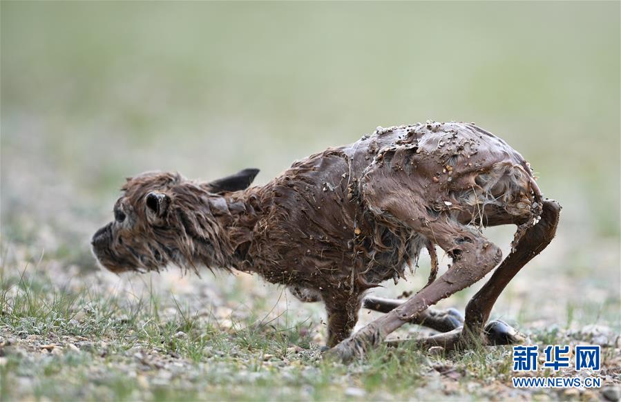 小羊湿漉漉的身躯呈黑褐色,细长的腿还不能完全撑起自己的身体。不断跌倒,不断爬起。它用力打直两条前腿,慢慢挺起身躯,后腿虽然不能完全笔直,但在摇摇晃晃中最终站了起来(6月24日摄)。新华社记者普布扎西 摄