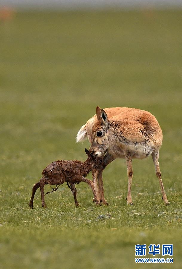 一只母藏羚羊在怀胎六个月后,顺利产下一只小羊(6月24日摄)。