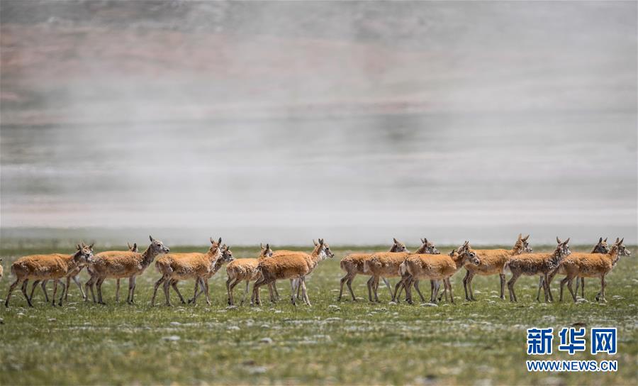 在羌塘国家级自然保护区内,一群母藏羚羊迁徙前往产仔地(6月24日摄)。新华社记者 普布扎西 摄