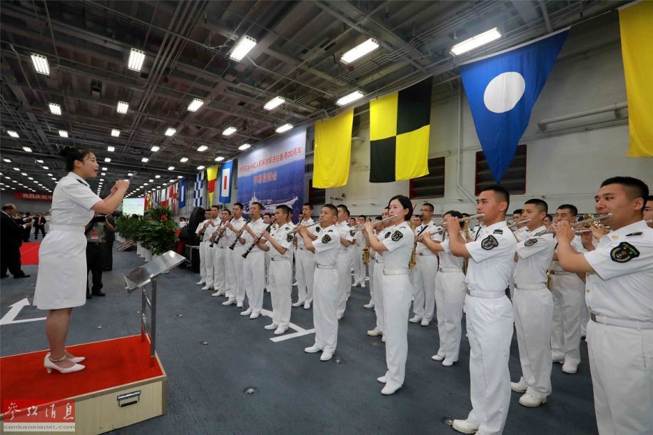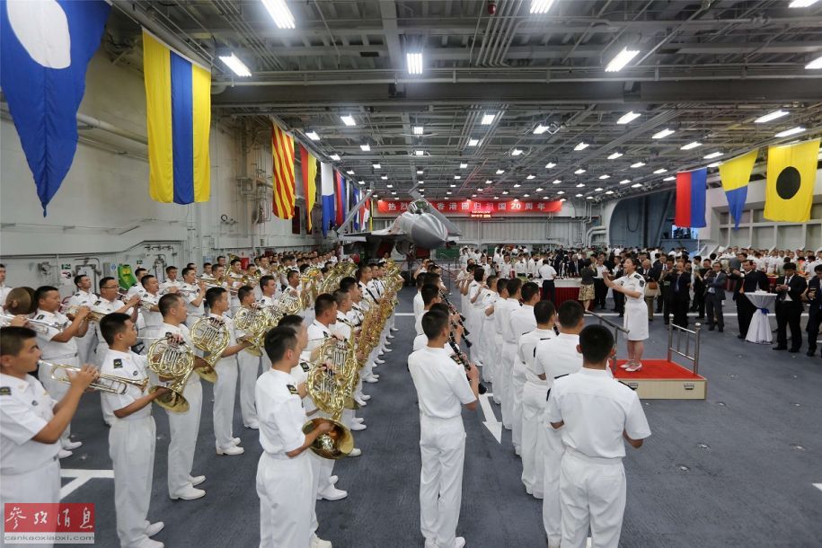辽宁舰军乐团在机库中奏乐助兴近景。