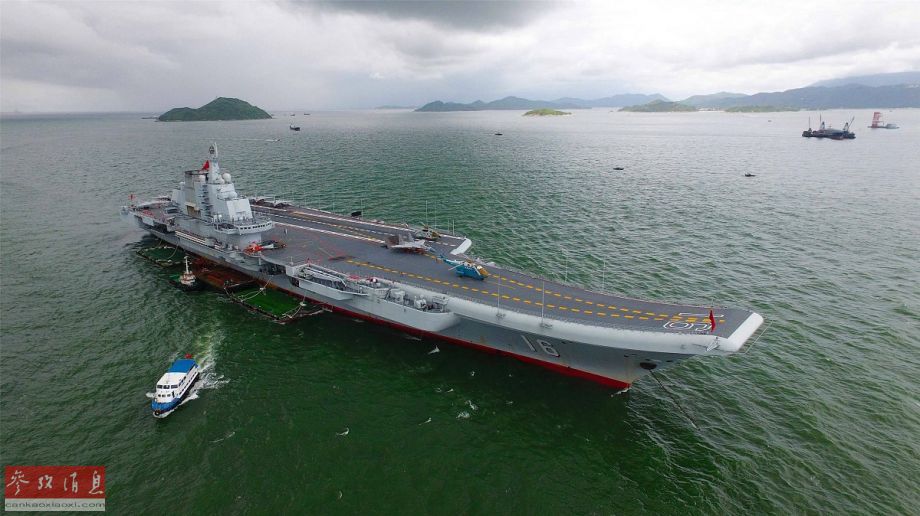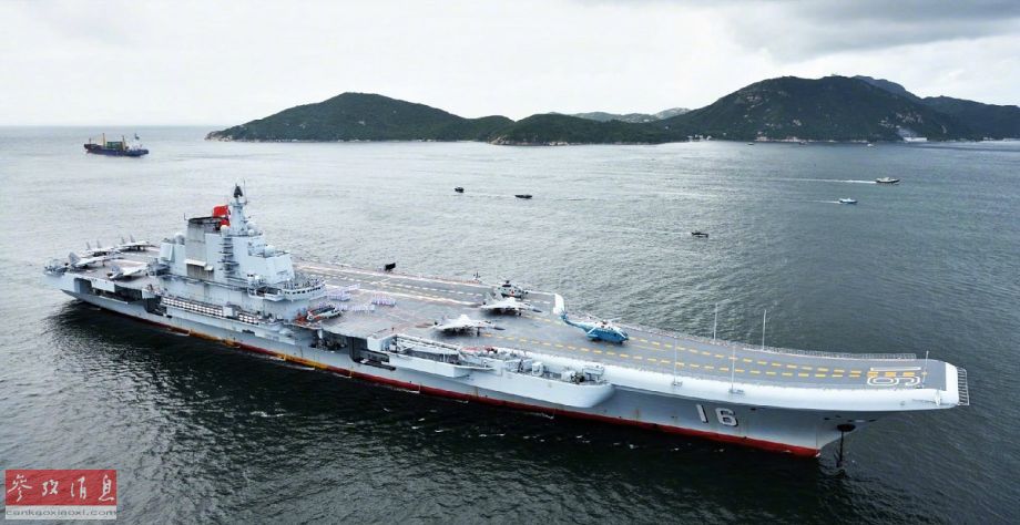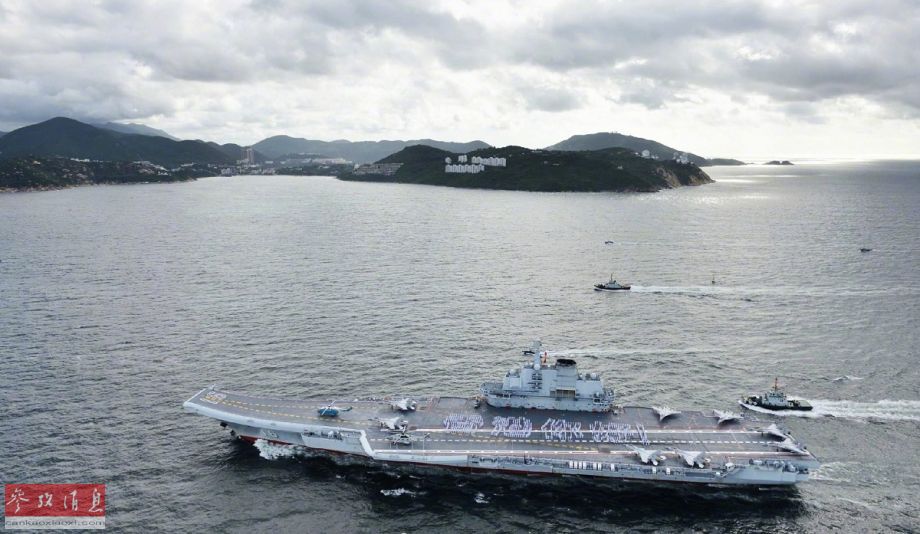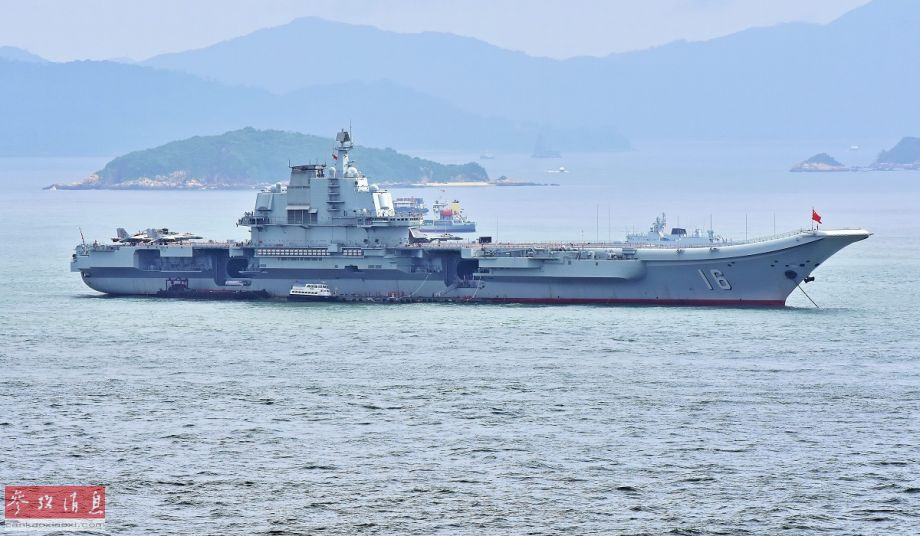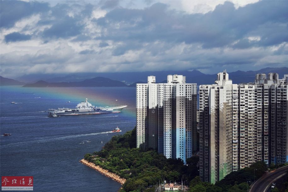 辽宁舰航母编队驶入香港附近海域,海面上出现了彩虹,十分壮观。