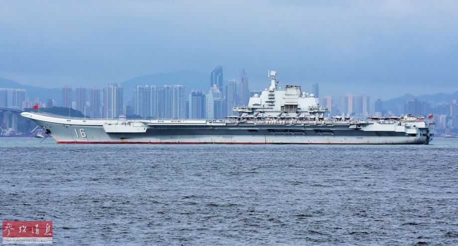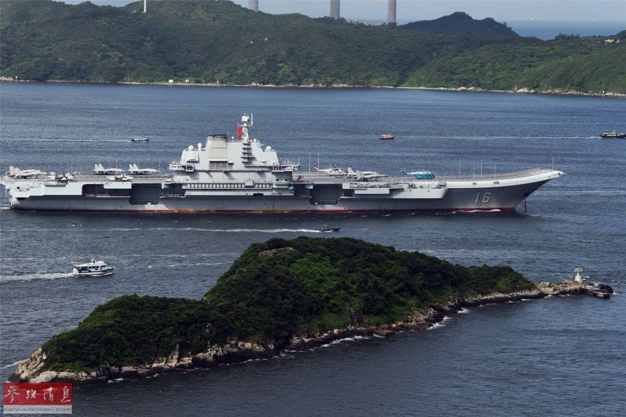 图为7月7日拍摄的,正在香港维多利亚湾内航行的辽宁舰航拍图。