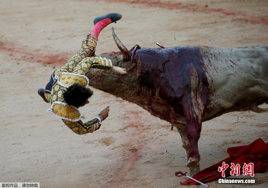 当地时间2017年7月11日,西班牙潘普洛纳,圣佛明节第六天,斗牛活动举行,场面血腥,一斗牛士被公牛顶伤,被抬出场地。