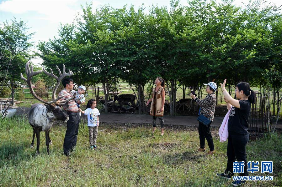 7月11日,游客们在敖鲁古雅鄂温克族猎民古葛军的新房及旅游点游玩。