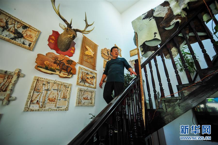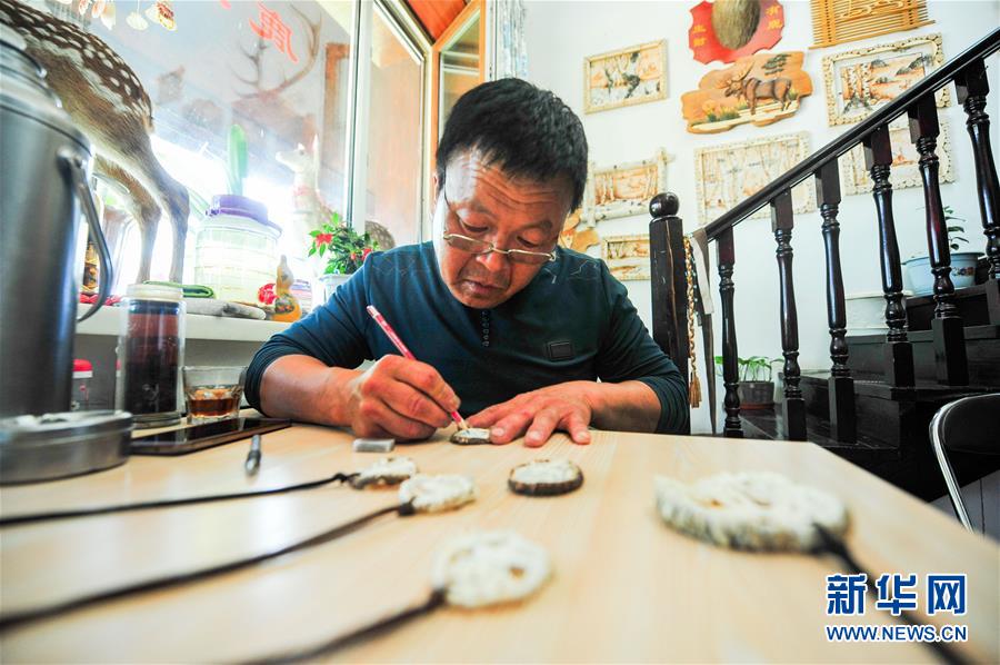 7月11日,敖鲁古雅鄂温克族猎民卜金林在家刻骨雕。