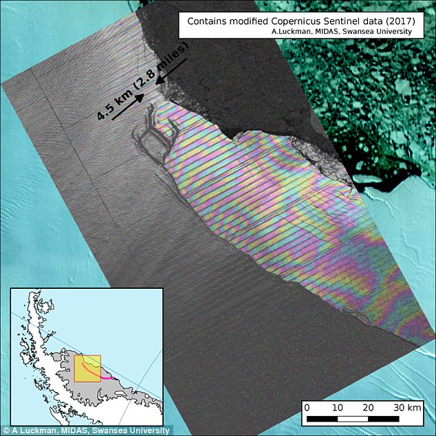 在南极的整个冬季,科学家都在一直使用欧洲航天局的卫星对冰架裂缝的进展进行监测。斯旺西大学教授Adrian Luckman说到:“此次分离的冰山是有记录以来最大的冰山之一,其未来的进展是很难预测的。”