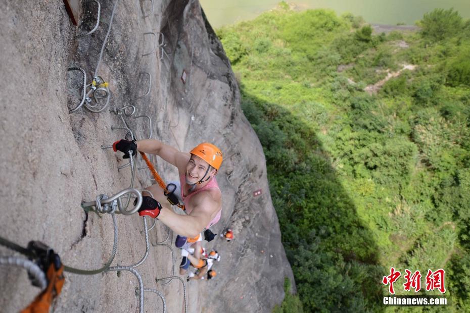 7月11日,湖南平江石牛寨举办中俄大力士“飞拉达”悬崖挑战赛,来自中国和俄罗斯的“大块头”爬上百米悬崖竞速。来自俄罗斯的大力士林帅(中文名)最终以32分28秒的成绩完成全长500米的“飞拉达”悬崖赛道,获得冠军。杨华峰摄