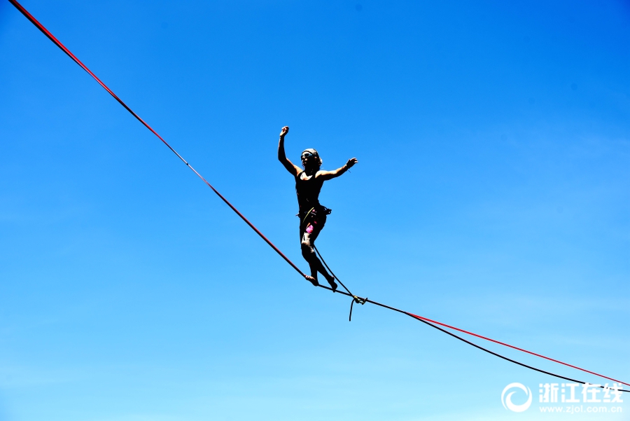 2017年7月16日,扁带选手在神仙居景区南天桥区域高空表演。