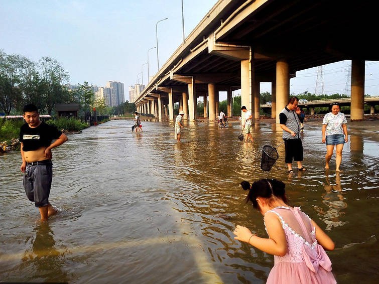 2017年7月15日,北京石景山区莲石湖畔因受凌晨暴雨影响,湖面水位上涨,水面溢出大桥下停车场,吸引市民前来捉鱼。来源:视觉中国