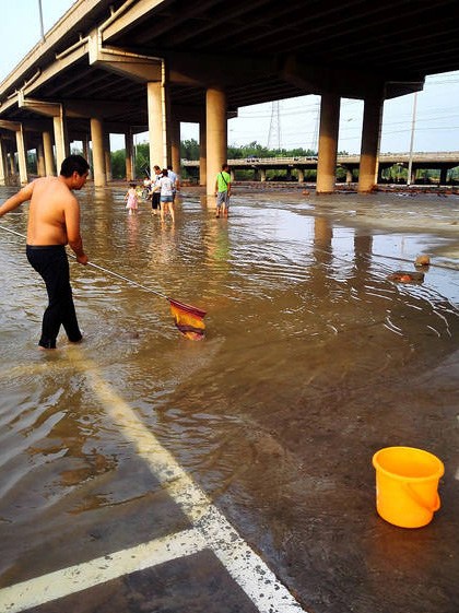 2017年7月15日,北京石景山区莲石湖畔因受凌晨暴雨影响,湖面水位上涨,水面溢出大桥下停车场,吸引市民前来捉鱼。来源:视觉中国