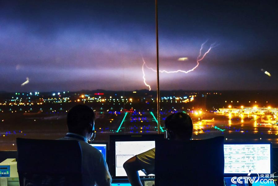 “北京,CDG4855,由于天气,终止进近,现在需要立即右转航向090!”“CDG4855,北京进近,航向090同意,上升到2100米保持。”7月13日晚,由于首都机场雷电交加,大风和冰雹的侵袭,已经在航道上进近的飞机纷纷选择了终止进近。一时间,华北空管局的管制频率骤然紧张了起来。管制员们不断向后续机组报告天气情况,询问复飞机组意图,平稳有序的发布每一条指令,指挥飞机绕飞雷雨,保障每一架航班在雷雨夜平安飞行。(摄影周越)