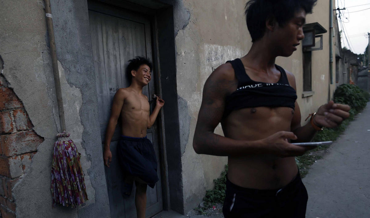 罗云龙身后的罗贵平,今年14岁,贵州六盘水人,父母在工地上班,他负责洗衣做饭。入伏后,他也学着大人的样子,整天光着膀子,不愿呆在闷热的出租房内。生活在这里的人们,租房内除了电风扇,几乎看不见一台空调,在闷热的租房内,电网扇吹出的风也是暖的。