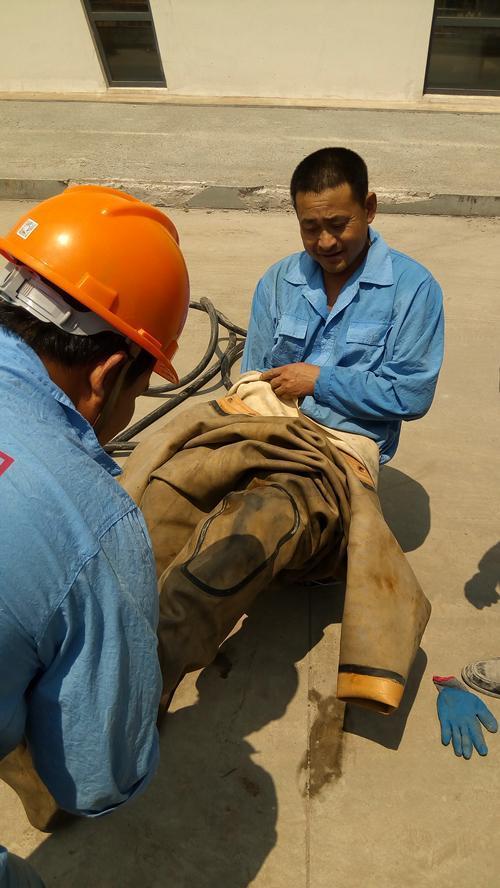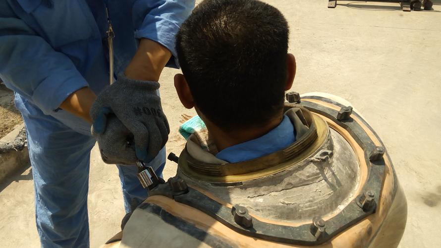 大约5分钟后,姜桂章已经湿透。这还没完,趁着他擦汗的间隙,两位帮手一左一右,用工具拧紧潜水衣领口防水条上的12个螺帽,再系紧连接潜水衣的两条“命脉”——保险绳索和空气输送管,最后,盖上潜水帽。