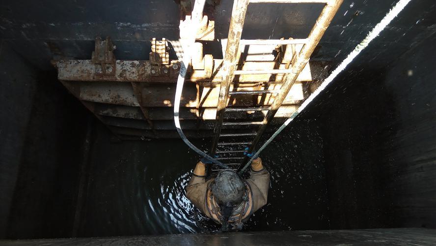 顺着阳光往下望去,紧闭的闸门外形成了一个污水池,上面漂浮着各种垃圾,散发出一股类似臭鸡蛋的味道,而这正是姜桂章要潜入的地方。顺着扶梯,姜桂章几乎是一步一停地往下挪,大约2分钟后,潜水帽彻底被污水淹没。