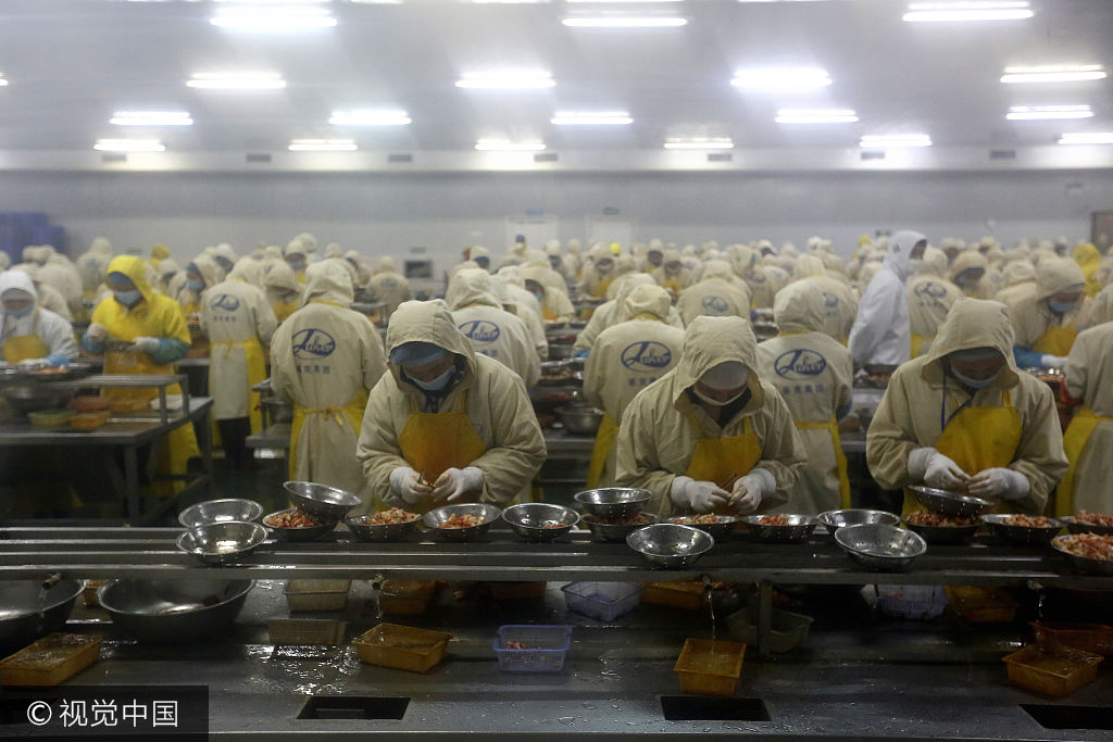 2017年7月15日,在湖北省潜江市一家小龙虾食品公司生产车间看到,5000多名工人双指飞舞,熟练地剥起虾仁。这些剥虾工是临时召集来得,一个工人剥1斤虾球能赚14元。旺季结束后,工人们就要解散回家。在生产加工车间,数千名工作人现在数千人现场剥小龙虾虾球。场面十分壮观。来源:视觉中国
