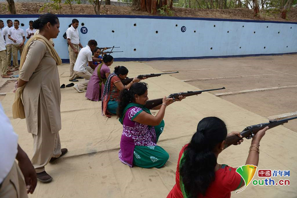 当地时间2014年6月17日,印度艾哈迈达巴德,印度妇女参加为期五天的枪械训练。此次训练由古吉拉特邦政府,警方及步枪训练俱乐部联合组织,目的是增强女性自我防御能力。此训练面向15岁以上女性,将会有20500人参加。
