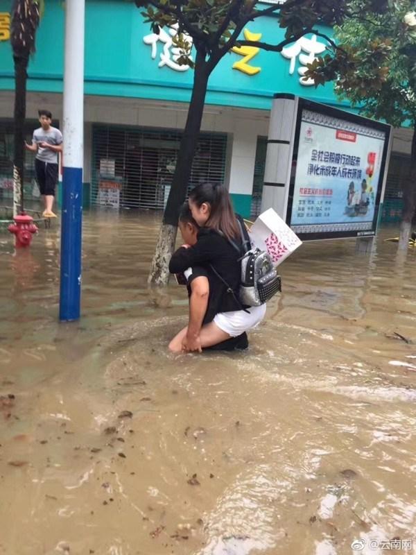 两小伙这一举动是义务的,图为其中一名小伙在背人过路。
