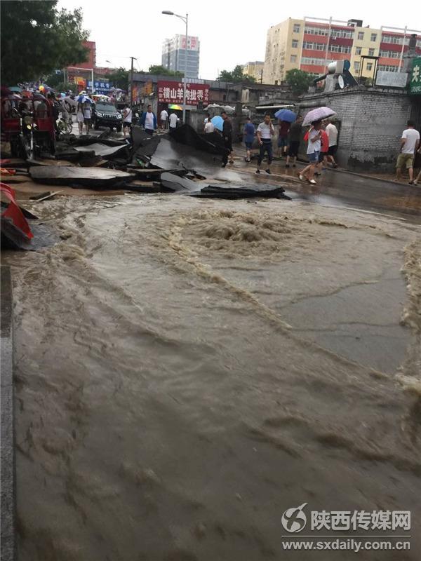 榆林城区突降暴雨 路段被冲毁多处现内涝榆林市气象台今日中午12时04分曾发布雷电黄色预警信号称,“预计未来6小时内,我市将有雷电活动,并伴有短时强降水和大风”。