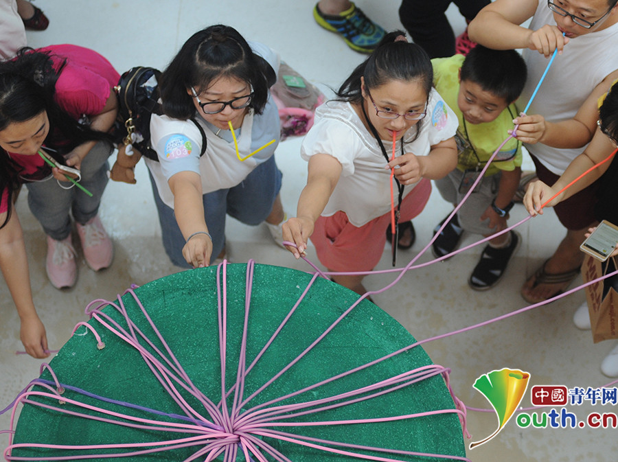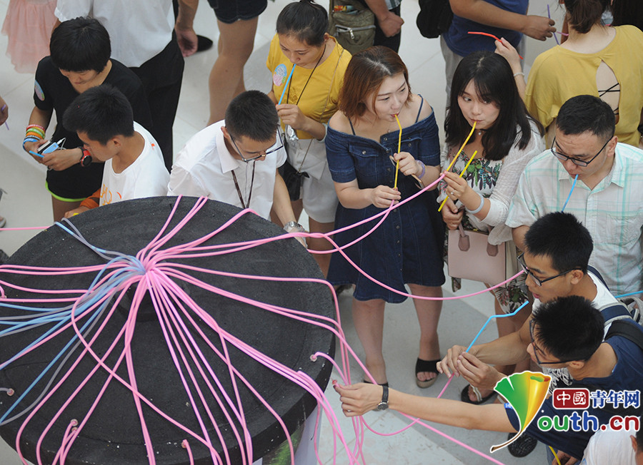 工作人员在巨型饮料杯里放置的吸管有上百条之多,每条吸管口都装有特殊设置的工具,人们使用吸管只能吸,不能吹。中国青年网 高明摄
