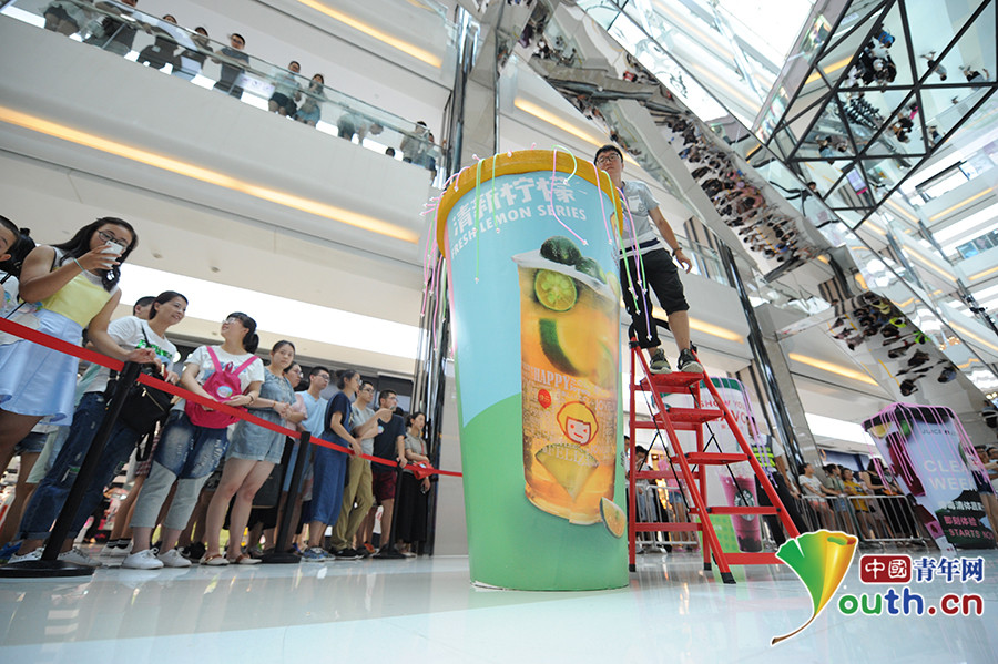 百余民众围着巨型饮料杯,场面壮观。中国青年网 高明 摄