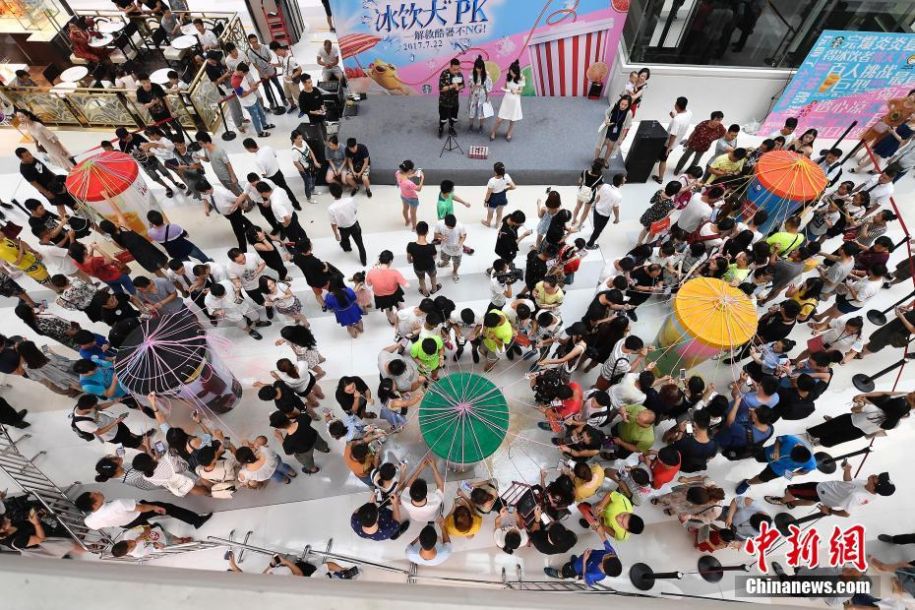 2017年7月22日,山西省太原市百余民众围着巨型饮料杯,使用一次性吸管进行冰饮挑战赛,在酷热的夏天寻找清凉。该巨型饮料杯高2米,直径1米,可容纳100斤饮料。最终,现场的5座巨型饮料杯所盛装的500斤冰镇饮料被参与民众全部喝光。