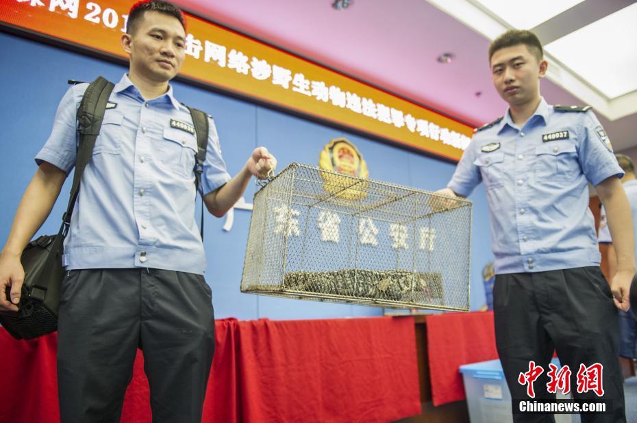 7月24日,广东省公安厅举行新闻发布会通报,今年3月至6月,广东警方展开“森网2017”专项行动,对通过网络贩卖野生动物及其制品等违法犯罪予以打击整治,共侦破刑事案件40余起、行政案件20余起,抓获、打击处理人员50余名,收缴野生动物11720余头/只、野生动物制品960余千克,涉案案值750余万元人民币。图为警方抓获涉案嫌犯。中新社发 粤警 摄