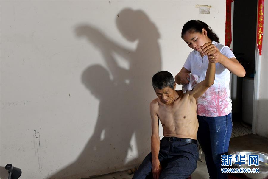 7月13日,张菊在洗浴间给养父擦澡。父亲病重卧床期间,她每天都给父亲翻身、按摩,擦洗身体。