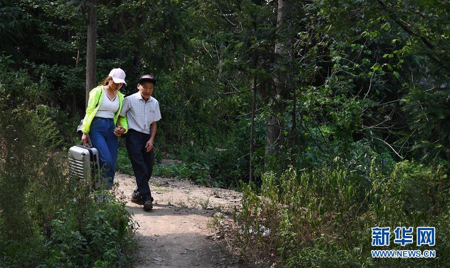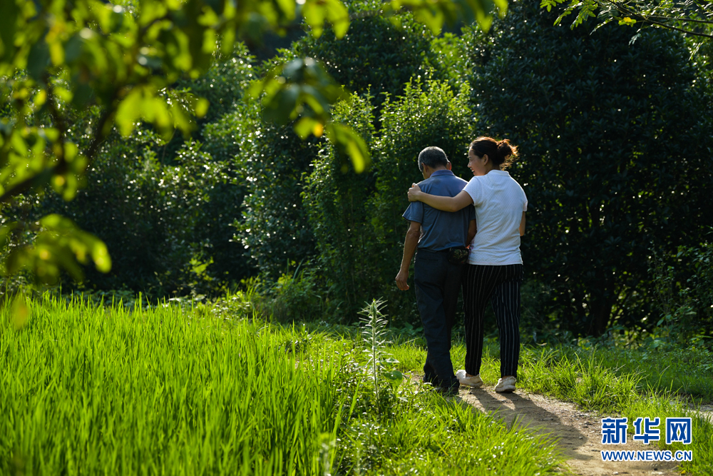 7月24日,张志菊陪伴着养父在自家庭院散步。