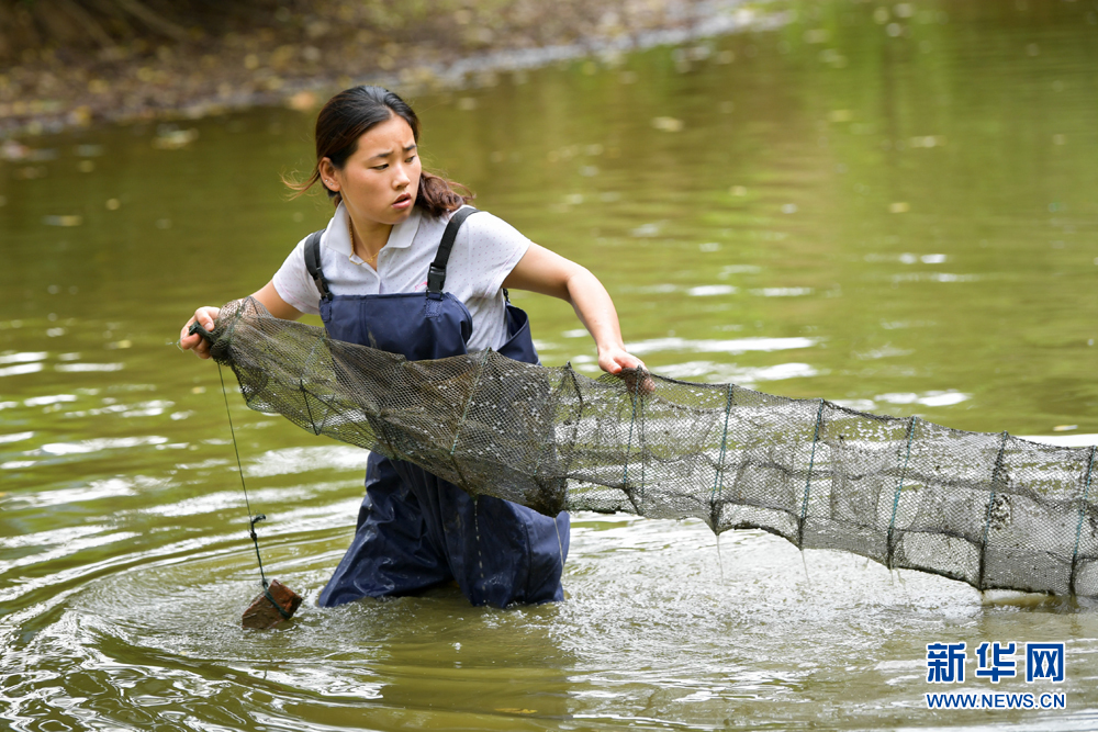 7月5日,张菊在自家鱼塘里为喜欢吃鱼的父亲捞鱼。刚出院时,父亲卧病在床。不能吃饭,张菊特地买了豆浆机,每天喂父亲流食。