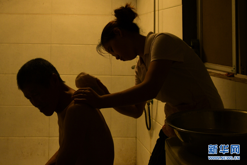 7月13日,张菊在洗浴间给养父擦澡。父亲病重卧床期间,她每天都给父亲翻身、按摩,擦洗身体。