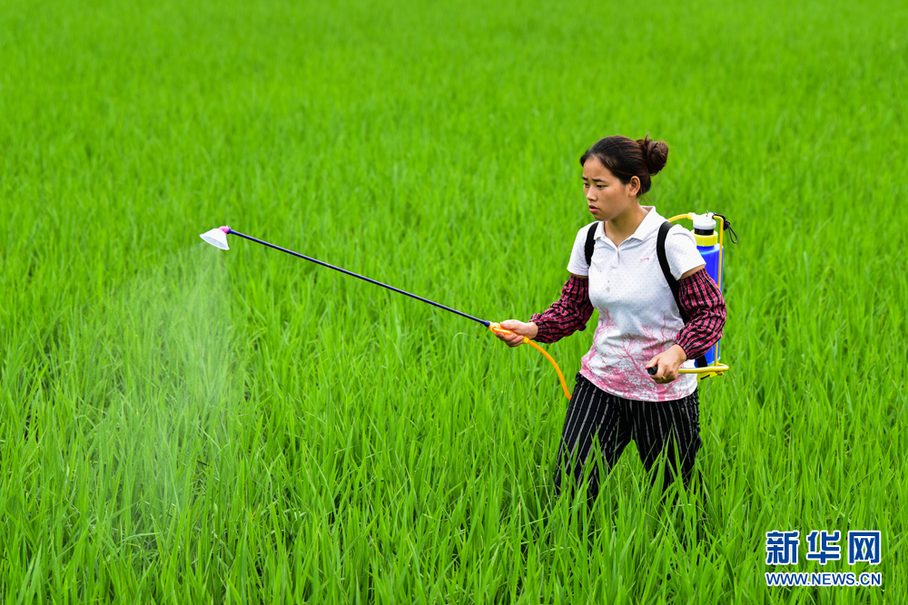 7月13日,张菊在承包的水田里给水稻喷洒农药。