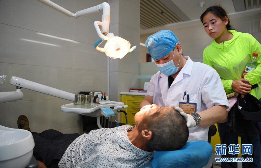 7月24日,在舒城县医院,张志菊(右)等待医生为养父检查病情。